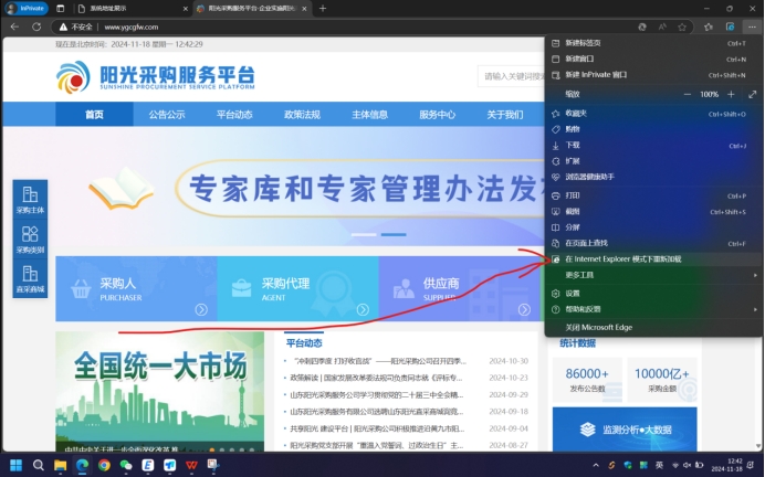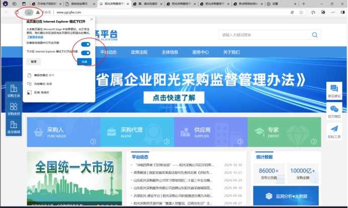 (六)此时网页在IE模式下加载,点击左上方IE标志,再勾上两个选项,浏览器模式切换成功。