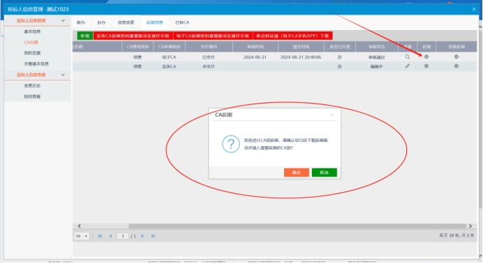 (一)首先登入系统,点击单位信息,再点击CA办理,选择延期续费,点击新增订单
